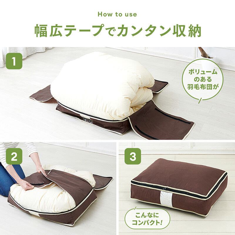 炭加工シートを挟んだ3層構造収納ケースで、気になる汗のニオイ・加齢臭を消臭!クローゼットのすき間にタテ収納!シングル用サイズの羽毛布団収納ケース。幅広テープで手間をかけずスッキリ収納!透明窓から中身が見える。普段使わない来客用の布団にも。※炭加工シートは底面(キルト面)に使用しております