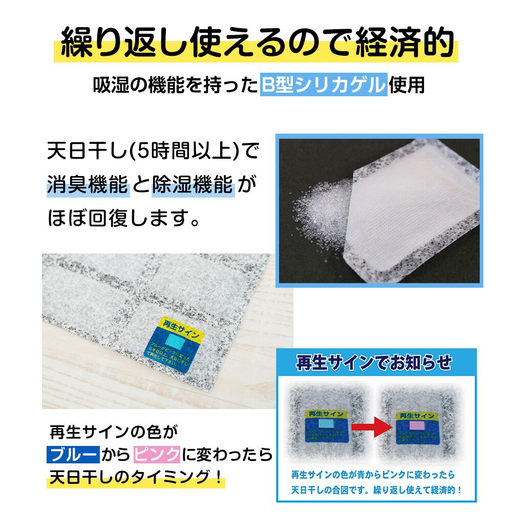 旭化成の活性炭入りポリエステル不織布「セミア(R)」とB型シリカゲルを使用した強力消臭&除湿シートです。B型シリカゲルが下駄箱内の湿気を除湿します。天日干し(5時間以上)をすると、消臭機能と除湿機能がほぼ回復し、繰り返し使用できます。再生サインシールの色がブルーからピンクに変わったら天日干しの時期です。企画・製造・検品まで国内自社工場で行う日本製。