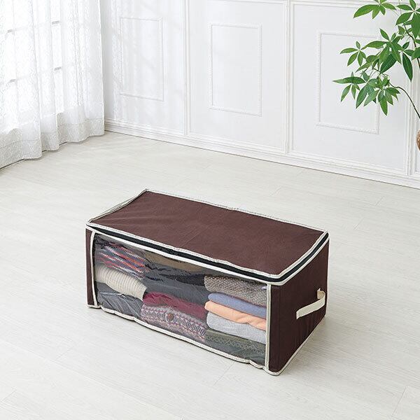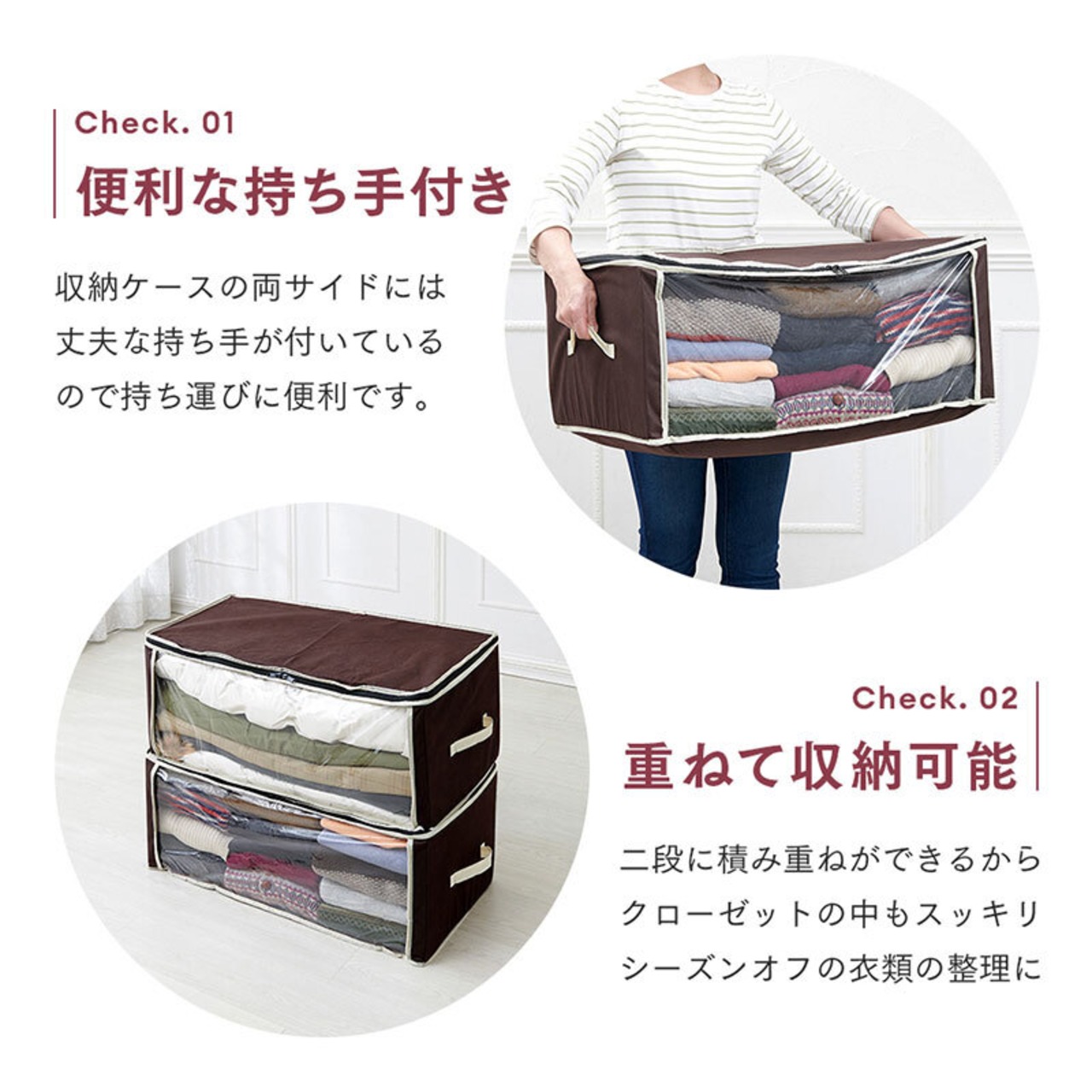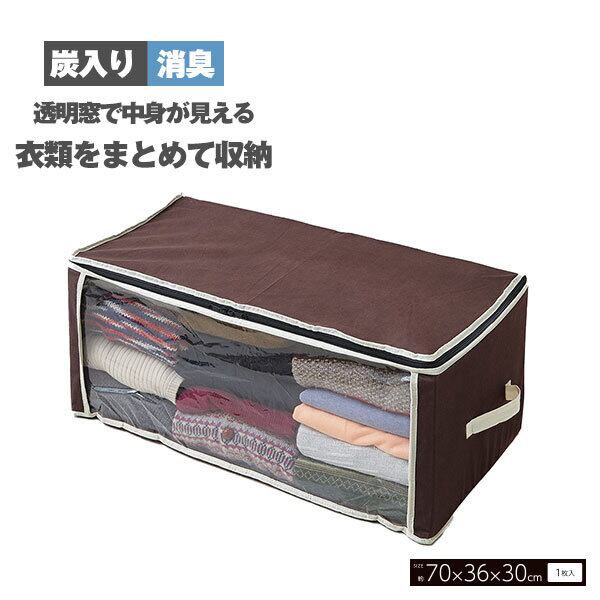 炭加工シートを挟んだ5層構造収納ケースで、気になる汗のニオイ・加齢臭を消臭!中が見える収納で分かりやすく収納!透明窓だから中身が見えて、確認がラクラク。丈夫な持ち手付きだから便利。二段重ねもOK。※炭加工シートは底面(キルト面)に使用しています。