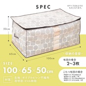 ホコリを防ぎ、おしゃれに収納。布団やこたつ布団の収納に。通気性のよい不織布製で、中身が分かる透明窓付き。大きく開くファスナーで出し入れしやすい。便利な持ち手付き。